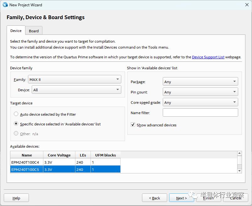 在“Family, Device & Board Settings”屏幕上,我們需要從“Device family”部分的下拉菜單中選擇“MAX II”(圖 6)。然后,從“Available devices”部分中選擇“EPM240T100C5”,因?yàn)檫@是 Altera MAX II EPM240 上的芯片。