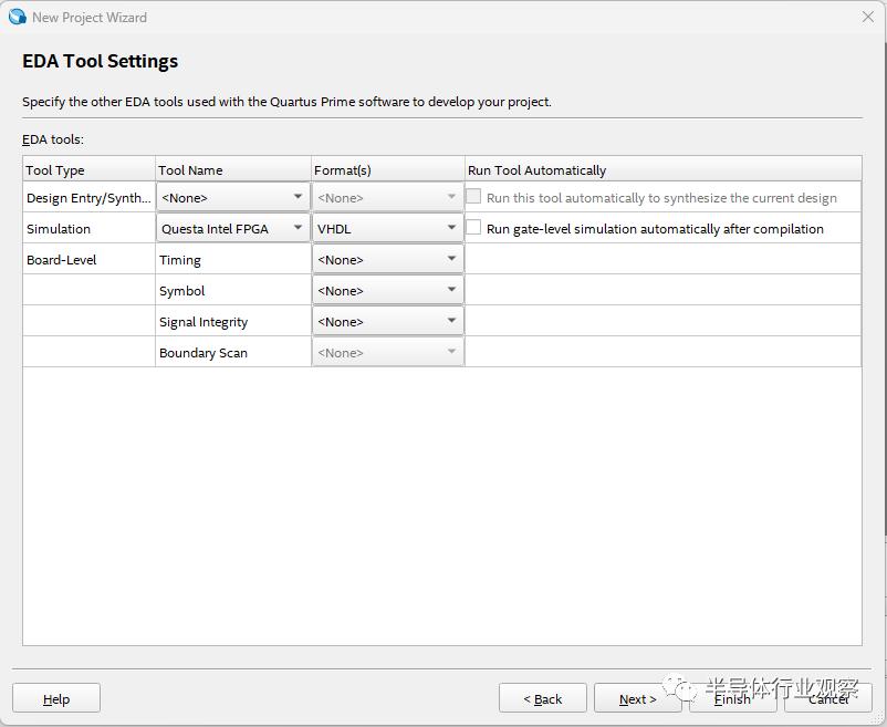 接下來,我們需要在“EDA Tool Settings”屏幕上將“Verilog HDL”更改為“VHDL”,單擊“下一步”,并檢查“Summary”中的一切是否正確(圖7)。之后,我們可以單擊“完成”按鈕,我們的新項(xiàng)目將被創(chuàng)建。