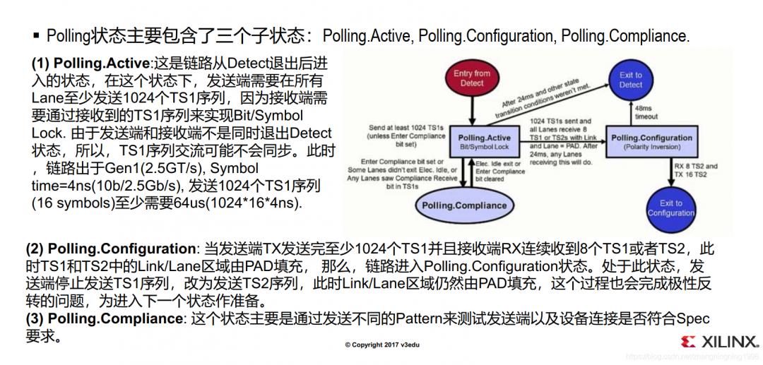 Polling 狀態(tài)的目的是"對暗號",實現(xiàn)無障礙溝通。進入這個狀態(tài)后, TX和RX之間通過發(fā)送TS1、 TS2 OS序列來確定Bit Lock, Symbol Lock以及解決Lane極性反轉(zhuǎn)的問題。