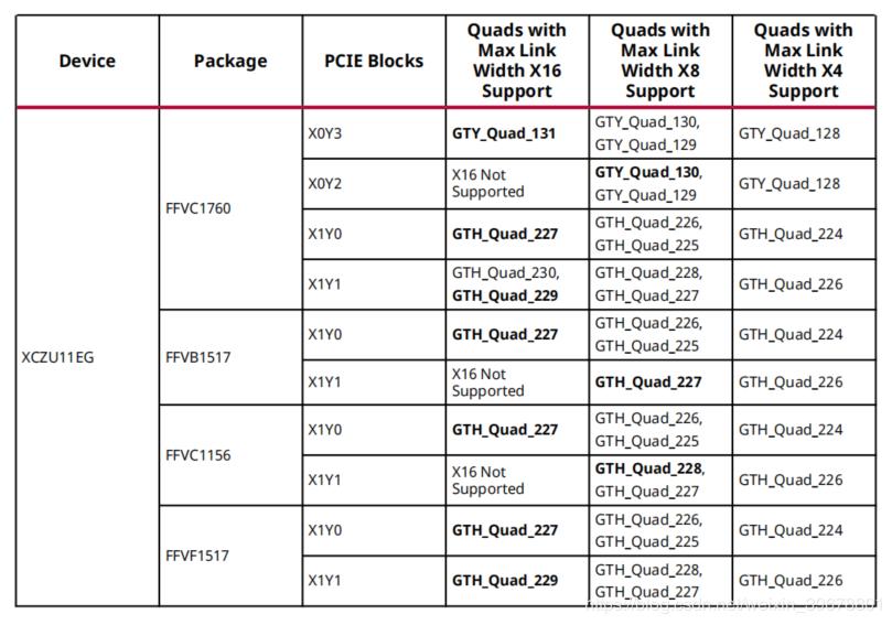先我們先對ZU11EG的資源進行分析,在UG1075中我們可以清楚的看到其包含4個PCIE塊,分別位于X0Y2,X0Y3,XIY1,XIY0.