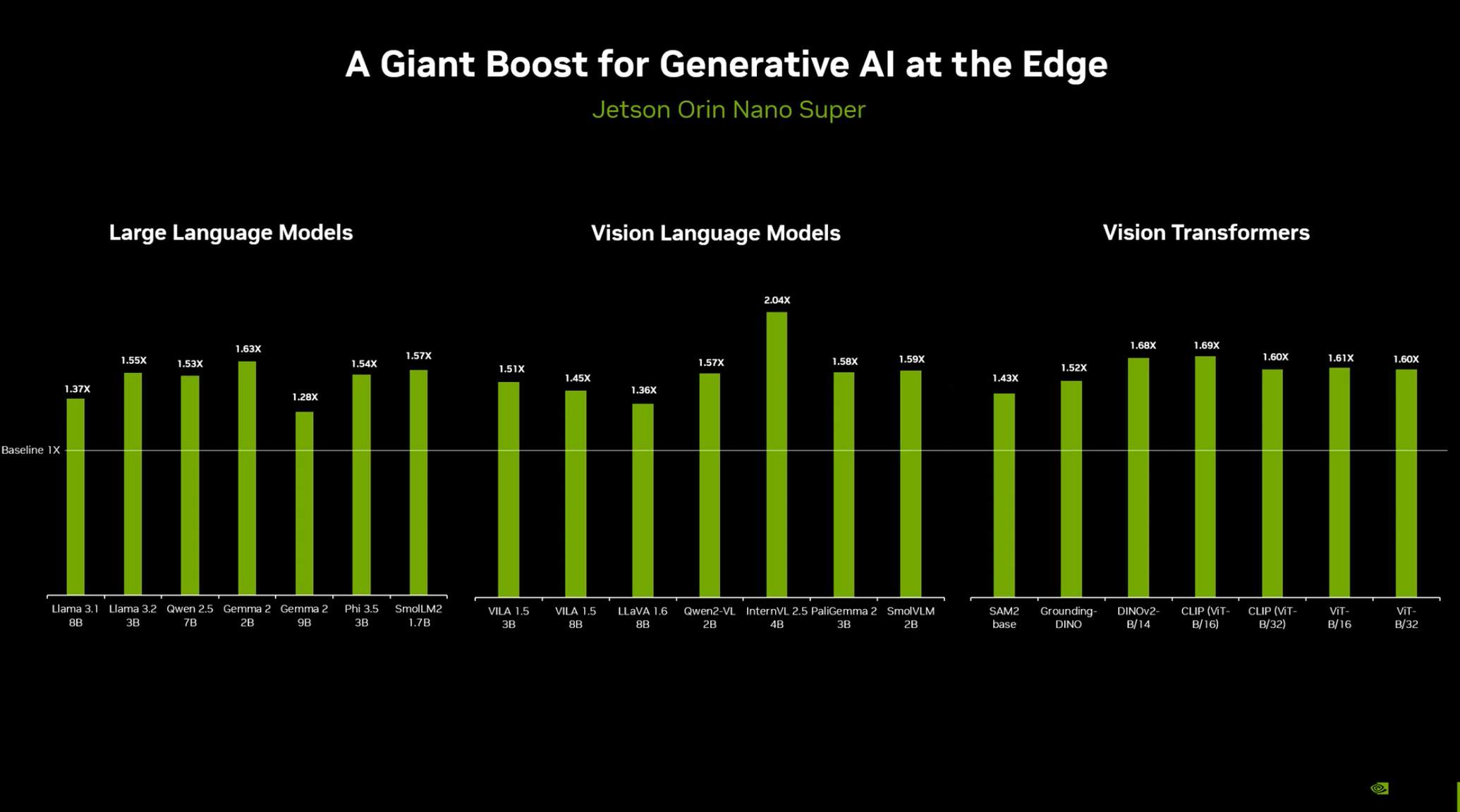 Jetson Orin Nano Super 開發(fā)平臺在邊緣端實現(xiàn)了對生成式 AI 和視覺模型的顯著性能提升,覆蓋大型語言模型(LLMs)、視覺語言模型(VLMs)和視覺 Transformer(Vision Transformers)三大領(lǐng)域,為邊緣設(shè)備帶來了更強(qiáng)大的智能推理能力。