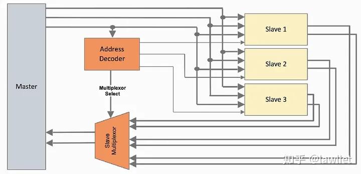 除了Master和Slave,總線中一般還包括哪些組件呢?比如有多個Slave的時候,那么自然要確定你的命令是發(fā)給哪個Slave的,這個時候我們就需要地址譯碼器。而當Slave返回數(shù)據(jù)的時候,Master需要知道是哪個Slave回的數(shù)據(jù),因此還需要MUX選擇器。