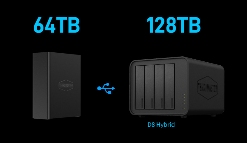 鐵威馬F8 SSD Plus采用先進(jìn)的硬件配置,搭載高性能處理器和大容量內(nèi)存,確保數(shù)據(jù)處理的高效性和穩(wěn)定性。其支持多盤位擴(kuò)展,最大可支持高達(dá)64TB的存儲空間,滿足用戶不斷增長的數(shù)據(jù)存儲需求。此外,通過USB3.2 10Gbps接口,F8 SSD Plus還能輕松連接USB外置存儲設(shè)備,實現(xiàn)存儲空間的進(jìn)一步擴(kuò)展。例如,與TerraMaster D8 Hybrid搭配使用,可額外增加高達(dá)128TB的存儲空間,滿足您不斷增長的數(shù)據(jù)存儲需求。