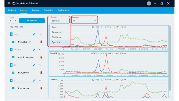 開發(fā)人員可以在導(dǎo)入自定義時間序列數(shù)據(jù)時定義通道和類別的數(shù)量。Time Series Studio還提供了多種數(shù)據(jù)查看選項,包括原始數(shù)據(jù)、時間數(shù)據(jù)、統(tǒng)計數(shù)據(jù)和光譜數(shù)據(jù)。