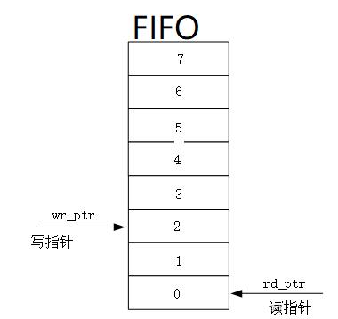 先觀察上圖,假定我們要設(shè)計(jì)的FIFO深度為8,那么指針寬度是4,因?yàn)閷挾葹?時(shí)無法區(qū)分空、滿。