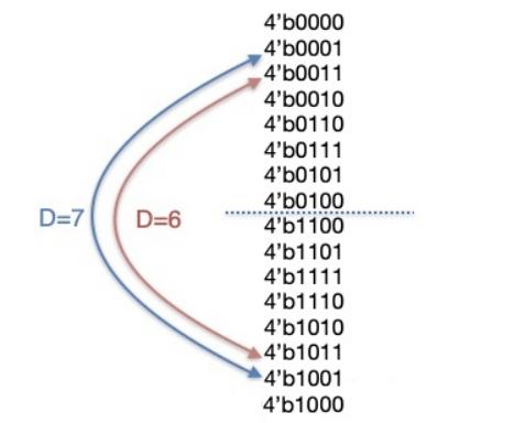 由這兩點(diǎn),我們發(fā)現(xiàn)格雷碼都可以關(guān)于某條對(duì)稱軸對(duì)稱。所以只有當(dāng)FIFO深度為2的冪次方時(shí),才能做到格雷碼繞一圈后,回到初始位置仍然只有1bit變化,如15(1000)----0(0000)。當(dāng)FIFO深度不為2的冪次方時(shí),顯然從最尾端跳轉(zhuǎn)到開頭端,變化的就不止一個(gè)bit了。比如FIFO深度為7,顯然,從13(1011)----0(0000),變化了可不止1bit。這樣的話在這一次跳變就失去了格雷碼存在的意義了,所以得想點(diǎn)其他辦法解決。