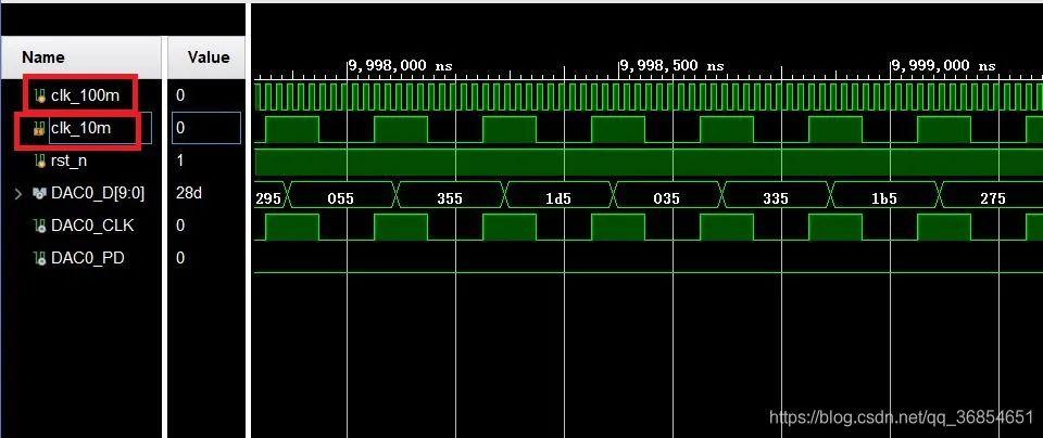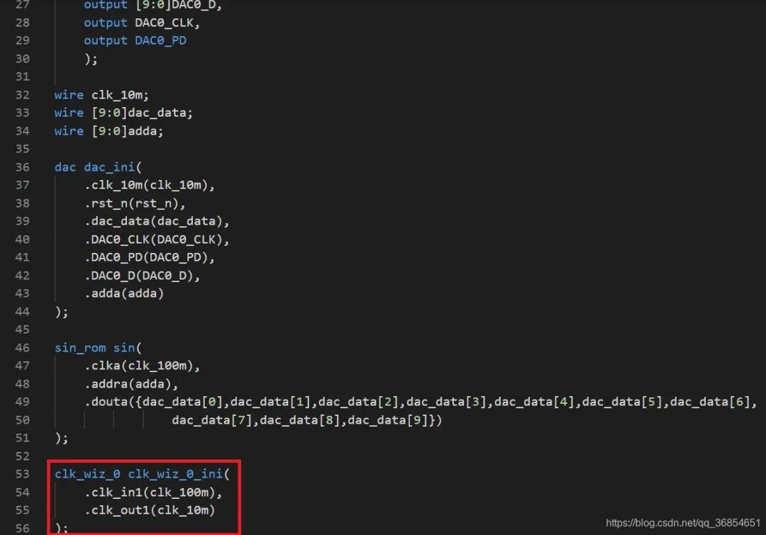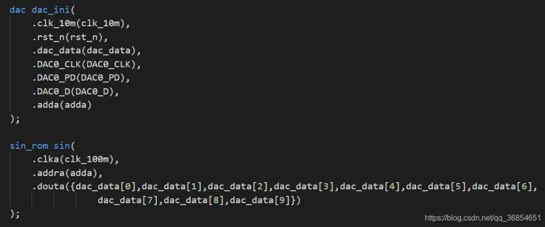 在代碼中調(diào)用IP核,我這里DAC是低位在前