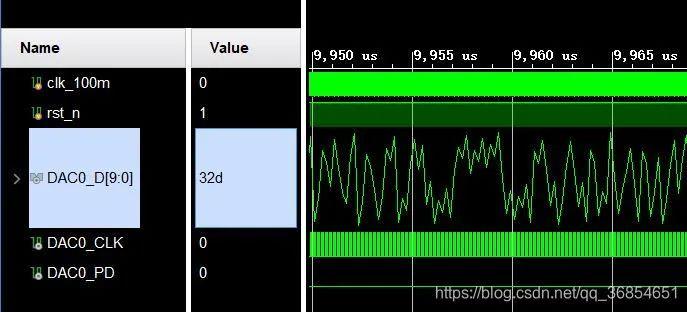 編寫好Testbench后,可以在仿真中看到正弦波,我這里因?yàn)榈臀辉谇?,所以波形雜亂。