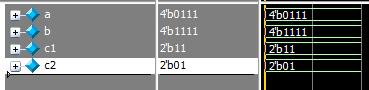 a & b的結果本來應該是4‘b0111 ,但是c1只有2位,所以高位被截斷,導致c1為2’b11;而a && b 的結果本來是1位的1’b1,但是c2有2位,所以會在高位補0,導致c2為2’b01。