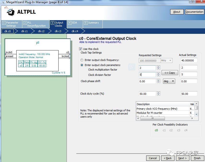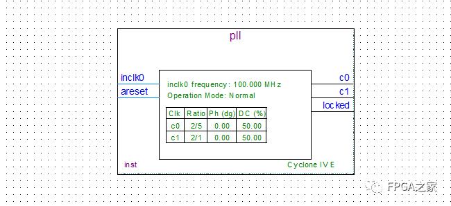 進(jìn)入quartus,建立工程,新建圖形文件,導(dǎo)入pll模塊,設(shè)定pll相關(guān)參數(shù)。