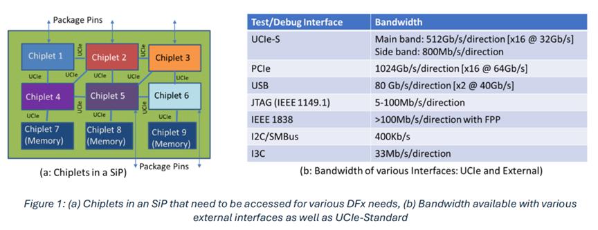 對(duì)于在封裝級(jí)別可控性和可觀察性有限的Chiplet,調(diào)試提出了獨(dú)特的挑戰(zhàn)(例如,無(wú)法在封裝內(nèi)插入邏輯分析儀或示波器)。行業(yè)應(yīng)如何處理 SiP 中芯片的可管理性?最重要的是,我們?nèi)绾伟踩亟鉀Q這些問(wèn)題?一些chiplets可能無(wú)法從封裝引腳直接訪問(wèn)(見(jiàn)圖 1a),這一事實(shí)使這些問(wèn)題變得更加困難。我們還需要處理各種帶寬需求。例如,不同的chiplets對(duì)掃描鏈、調(diào)試、可管理性等所需的帶寬范圍不同。