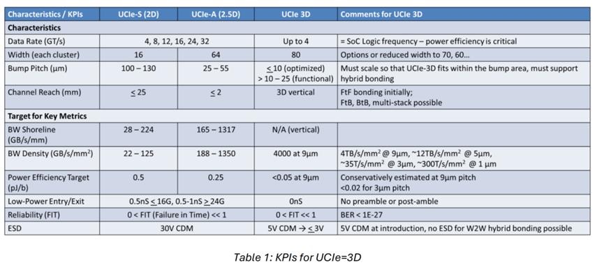 3D 封裝技術(shù)(例如混合鍵合 (HB:Hybrid Bonding))的最新趨勢(shì)是大幅縮Chiplet之間的凸塊間距。UCIe-3D 的目標(biāo)是將凸塊間距從 9 μm 縮小到 1 μm,甚至可能更低。3D 互連將Chiplet之間的距離縮小到幾乎為 0。因此,互操作性需要限制在相同的凸塊間距內(nèi)。雖然這不是一種廣泛的即插即用(即,凸塊間距為 1 μm 的芯片只能與凸塊間距為 1 μm 的另一個(gè)chiplet混合鍵合,而不能與凸塊間距為 9 μm 的chiplet混合鍵合),但關(guān)鍵性能指標(biāo) (KPI:key performance indicator) 的改進(jìn)(例如帶寬密度、功率效率等)是巨大的。如表 1 所示。