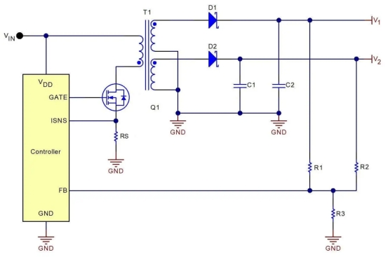 變壓器衍生的拓?fù)?例如反激式)允許電源通過向變壓器添加次級繞組來輕松創(chuàng)建多個輸出電壓。這就造成了您必須選擇要調(diào)節(jié)的輸出電壓的情況,這并不總是那么容易。它可能是具有最高功率的輸出,或者是需要嚴(yán)格調(diào)節(jié)的低壓輸出。