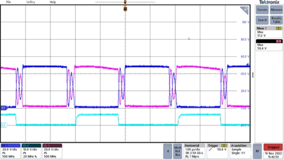 重新配置次級(jí)繞組后,開關(guān)波形看起來更接近預(yù)期;波形更加方形,阻斷電壓等于輸出電壓。關(guān)斷邊緣的泄漏尖峰也被消除。