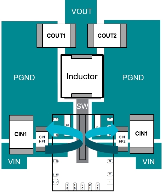 鏡像引腳配置使設(shè)計人員能夠連接兩個相同的并行輸入環(huán)路,這意味著他們可以將雙輸入電容(高頻和大容量)并聯(lián)放置在靠近兩對電源輸入 (PVIN) 和電源接地 (PGND) 的位置引腳。兩個并聯(lián)電流環(huán)路還將有效寄生電感減半。