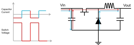 輸入電容器存儲電荷,在高側(cè)開關(guān)導(dǎo)通時提供電流脈沖;當(dāng)高側(cè)開關(guān)關(guān)閉時,它們由輸入電源充電(圖 1)。