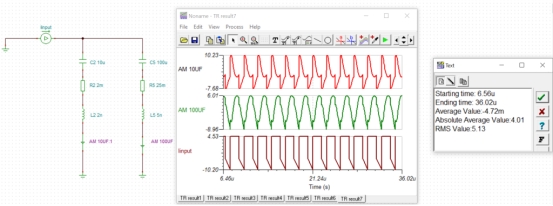 TINA-TI 軟件可以通過以下方式計算每個電容器支路中的 RMS 電流:運行仿真,單擊所需的電流波形將其選中,然后從波形窗口的 Process 菜單選項中選擇 Averages。 TINA-TI 軟件使用模擬開始和結(jié)束顯示時間的數(shù)值積分來計算 RMS 電流。