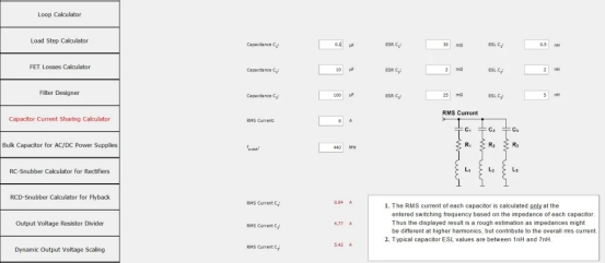 如果您使用多個較大的 MLCC,則可以將它們組合起來,并將等效電容輸入均流計算器,以計算并聯(lián)輸入電容器的 RMS 電流。 RMS 電流的計算僅考慮基頻。盡管如此,該計算工具還是對單輸入電容器 RMS 電流計算的有用改進。