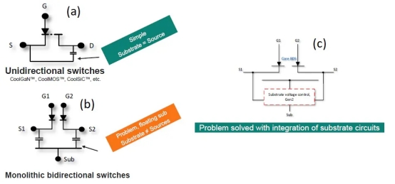 GaN 單向開關(guān)(例如 CoolGaN、CoolMOS 和 CoolSiC 產(chǎn)品系列中的開關(guān))使用基板作為開關(guān)器件的源極端子(圖 3a)。然而,對于單片 BDS,會(huì)出現(xiàn)一個(gè)問題,因?yàn)楦?dòng)基板與兩個(gè)源 S1 和 S2 不一致(見圖 3b)。