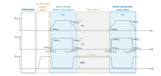 圖 2 中的波形描述了開關(guān)和應(yīng)力施加過程。該方法涉及向器件施加 600 V 的預(yù)偏置,持續(xù)時(shí)間小于 1 ms。經(jīng)檢查,這不會(huì)改變?cè)O(shè)備的開關(guān)屬性。