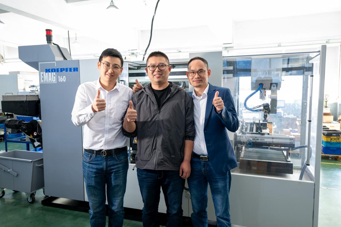 圖1:一鑫齒輪總經(jīng)理金佳(圖中),來(lái)自埃馬克太倉(cāng)的高級(jí)銷(xiāo)售工程師鄭澤亮(圖左)、產(chǎn)品經(jīng)理費(fèi)學(xué)平(圖右)