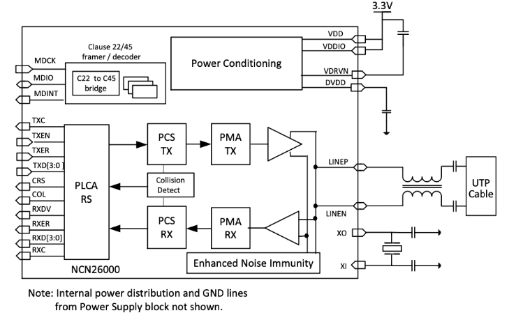 這兩款器件的主要區(qū)別在于,NCN26000 在一個 5mm x 5mm QFN 封裝中僅包含 PLCA-RS 和 PHY(TX + RX)。NCN26000 還需要 3.3 V 電源和 25MHz 外部時鐘。