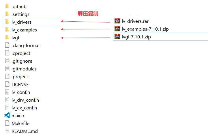 此時(shí),lvgl、lv_examples、lv_drivers這三個(gè)文件夾內(nèi)的內(nèi)容是空的,我們需要下載相關(guān)資源放進(jìn)去。比如: