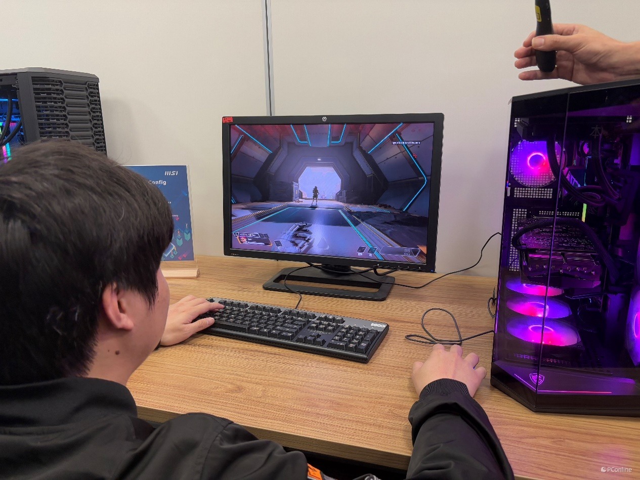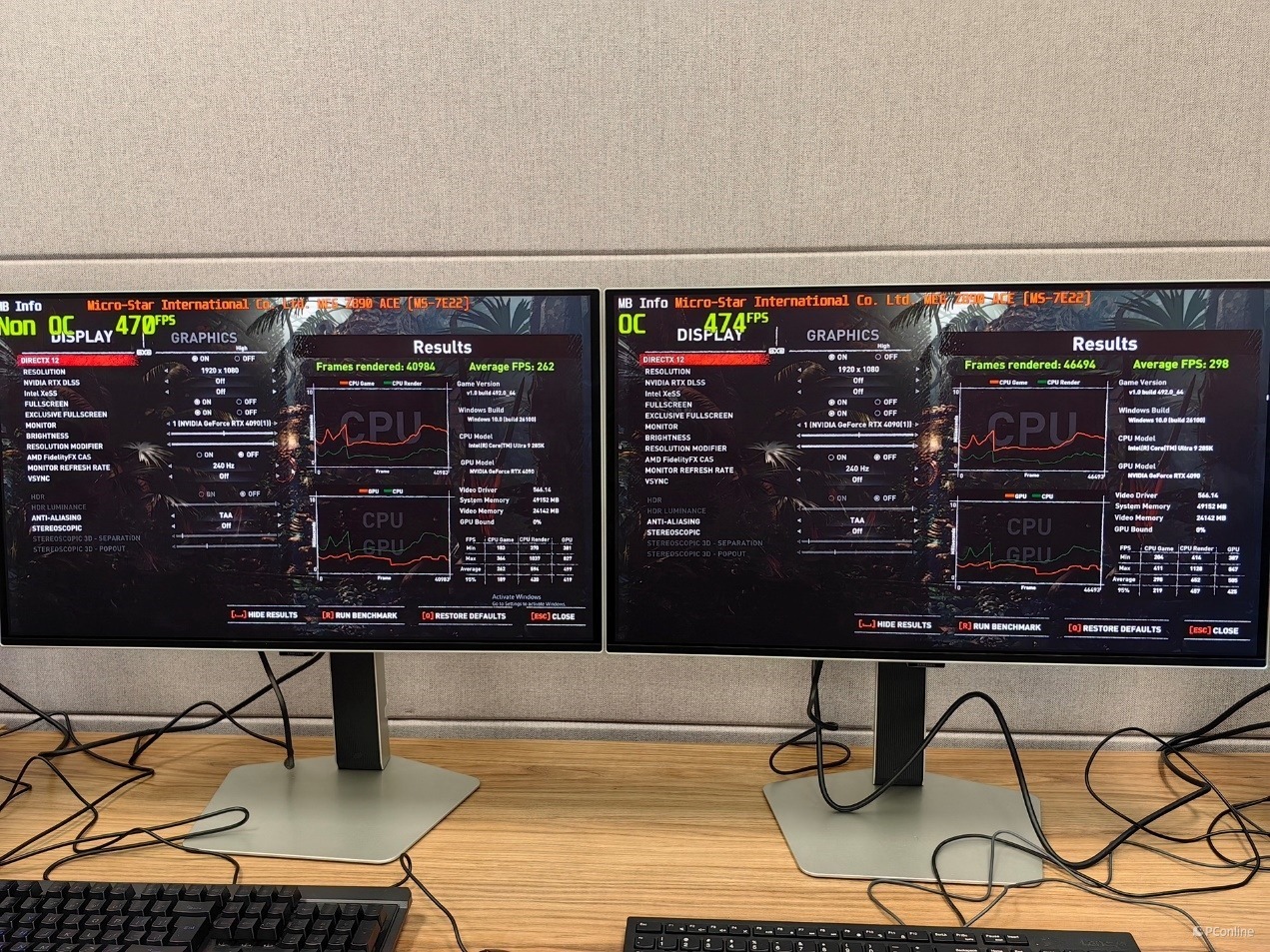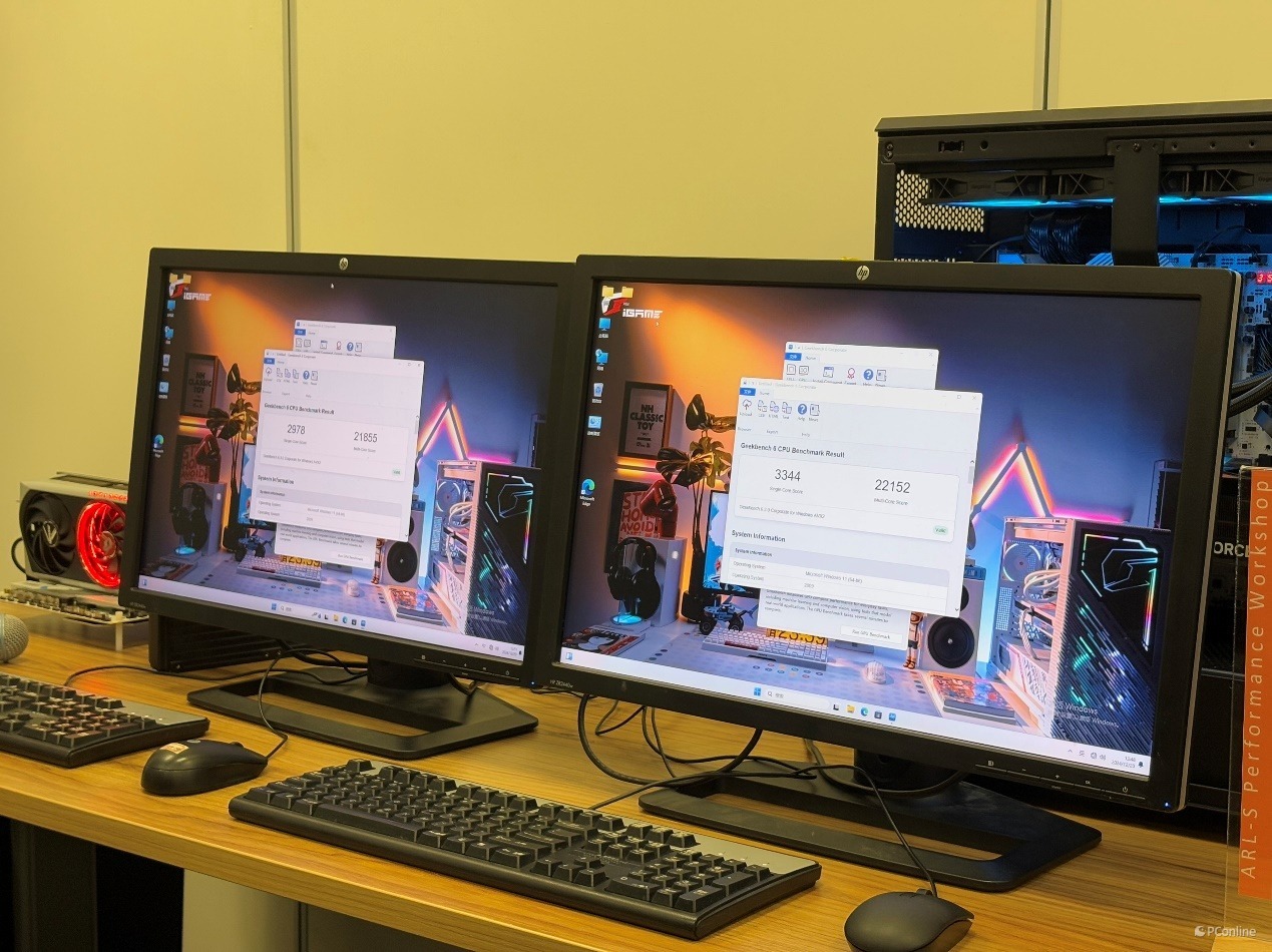 既然說(shuō)到酷睿Ultra 200S能夠輕松做到8000+MHz的內(nèi)存頻率,下面不妨看看Intel在現(xiàn)場(chǎng)演示的Demo,究竟高頻內(nèi)存能夠帶來(lái)怎樣的性能增益。以下測(cè)試的硬件配置完全一致,僅內(nèi)存頻率的差距,左邊為DDR5-6400MHz,而右邊則是DDR5-8400MHz。