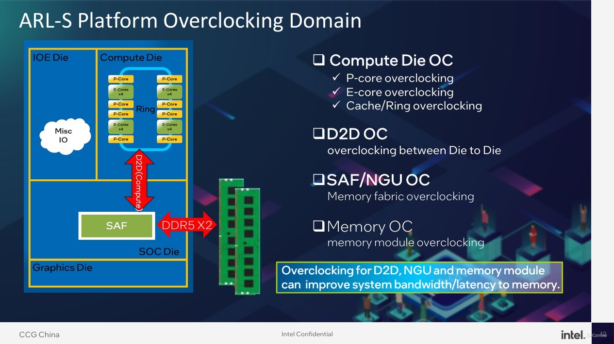 除此之外,計(jì)算模塊和SoC模塊都擁有獨(dú)立的頻率、玩家可以針對(duì)單個(gè)模塊進(jìn)行超頻。同時(shí)Arrow Lake-S還擁有更多細(xì)致的超頻參數(shù),這些參數(shù)對(duì)性能有著關(guān)鍵性的影響,例如在內(nèi)存超頻中SAF和NGU的重要性,這兩個(gè)組件主要負(fù)責(zé)處理器的內(nèi)存訪問控制,玩家針對(duì)這兩個(gè)參數(shù)進(jìn)行超頻,則可以顯著降低內(nèi)存延遲,提升數(shù)據(jù)傳輸速率,這對(duì)于需要大量?jī)?nèi)存帶寬和低延遲的游戲和專業(yè)應(yīng)用來(lái)說(shuō)尤其重要。