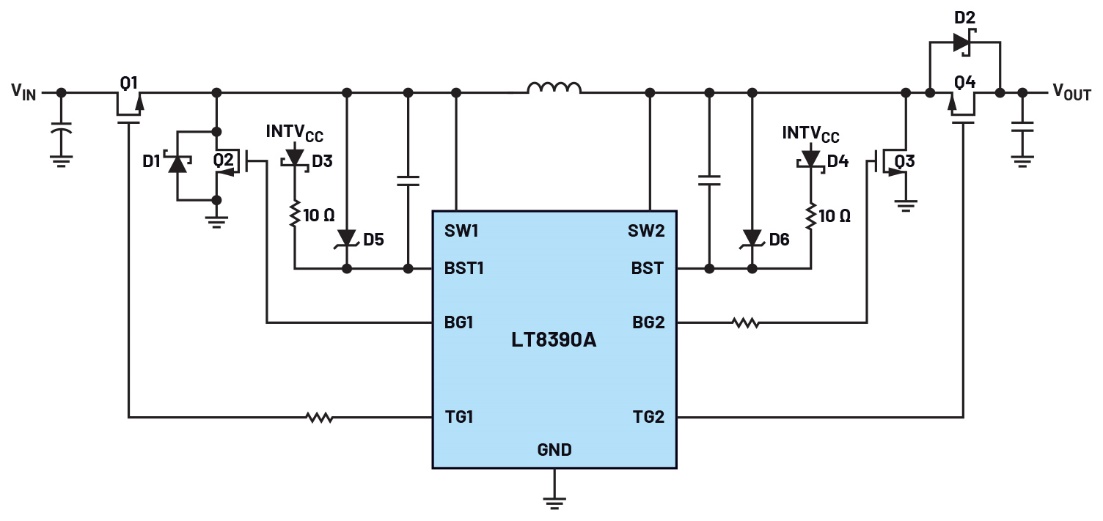 眾所周知,GaNFET比較難驅(qū)動,如果使用原本用于驅(qū)動硅(Si) MOSFET的驅(qū)動器,可能需要額外增加保護元件。適當選擇正確的驅(qū)動電壓和一些小型保護電路,可以為四開關(guān)降壓-升壓控制器提供安全、一體化、高頻率GaN驅(qū)動。