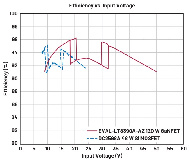 在室溫、24 V輸出下,GaNFET可產(chǎn)生120 W功率。該板尺寸與之前的LT8390A評估板DC2598A相當,后者使用硅MOSFET,并提供12 VOUT和48 W功率。