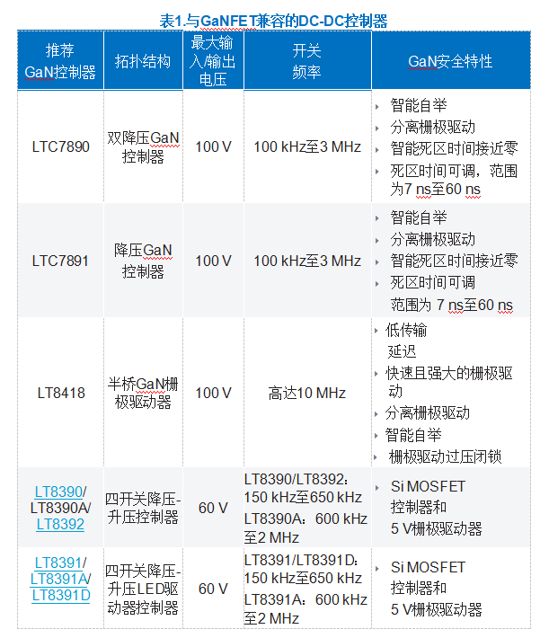 如果沒有專門用于驅(qū)動GaNFET的DC-DC控制器,我們?nèi)匀豢梢杂行У仳?qū)動GaNFET。在電路板面積近似時,即便使用原本用于驅(qū)動Si MOSFET的控制器,EVAL-LT8390A-AZ也能輕松輸出更大的功率并實現(xiàn)更高的效率。表1推薦了多款用于驅(qū)動GaNFET的控制器。如果功率要求更高,例如并聯(lián)降壓-升壓GaNFET控制,請聯(lián)系廠家。通過研究提供5 V柵極驅(qū)動器的控制器并整合額外的外部保護電路元件,我們可以安全地驅(qū)動GaNFET,并探索電源轉(zhuǎn)換設(shè)計中的更多選擇。