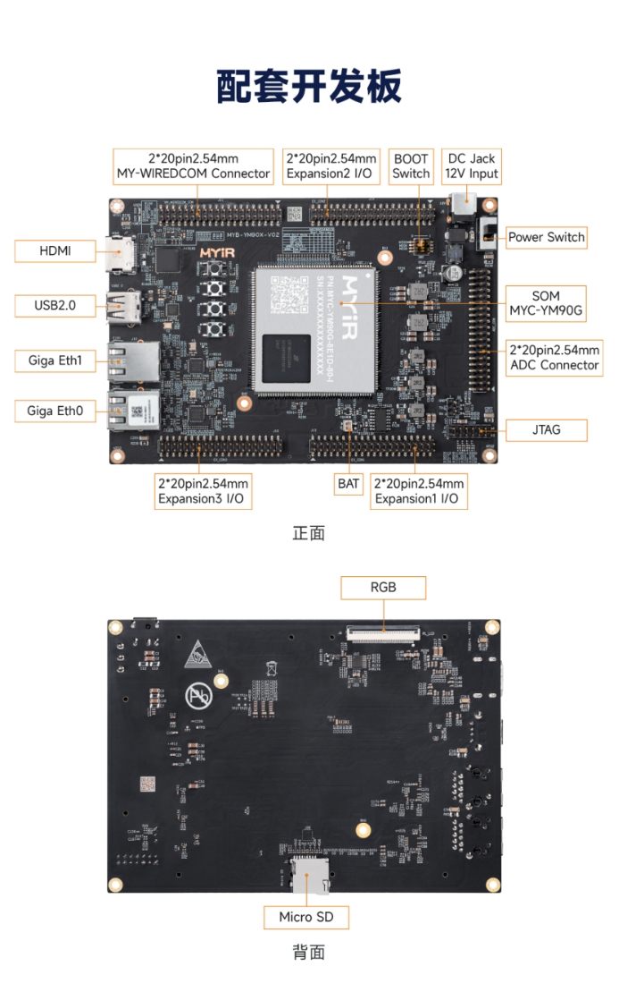 MYC-YM90X核心板支持多種型號(hào)配置,用戶可根據(jù)項(xiàng)目需求選擇不同存儲(chǔ)與接口規(guī)格。此外,米爾提供全套開發(fā)板解決方案,包含必要的外圍接口模塊,助力用戶快速搭建測(cè)試環(huán)境。