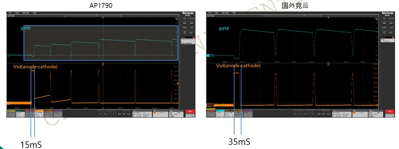 圖6. AP1790驅(qū)動(dòng)電壓為7.3V~6.3V,滿足高壓MOSFET的驅(qū)動(dòng)電壓要求。而市場(chǎng)競(jìng)爭(zhēng)對(duì)手的驅(qū)動(dòng)電壓較低(6V~5V),MOSFET的RdsON變化較大(圖中黃色為陽(yáng)極到陰極的壓降,在MOSFET工作時(shí)壓差變化大)