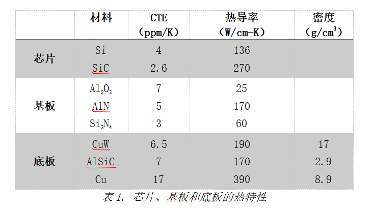 為了使芯片保持較低的運(yùn)行溫度,需要較低的導(dǎo)通電阻和熱阻。模塊中使用的材料是決定結(jié)至外殼熱阻及其可靠性的基本要素。具體來說,芯片粘接、基板和底板材料特性是形成模塊熱阻的主要因素。選擇高熱導(dǎo)率的材料有助于最大限度地降低熱阻和結(jié)溫。除了熱性能之外,選擇熱膨脹系數(shù)(CTE)緊密匹配的材料可以降低材料界面和內(nèi)部的熱應(yīng)力,從而延長(zhǎng)模塊的使用壽命。表1匯總了這些熱特性。氮化鋁(AlN)基板和銅(Cu)底板是mSiC功率模塊的標(biāo)配。氮化硅(Si3N4)基板和鋁碳化硅(AlSiC)底板的可靠性更高。圖2給出了采用通過DO-160認(rèn)證的標(biāo)準(zhǔn)SP3F和SP6C封裝以及高可靠性無底板BL1和BL3封裝的共源功率模塊。