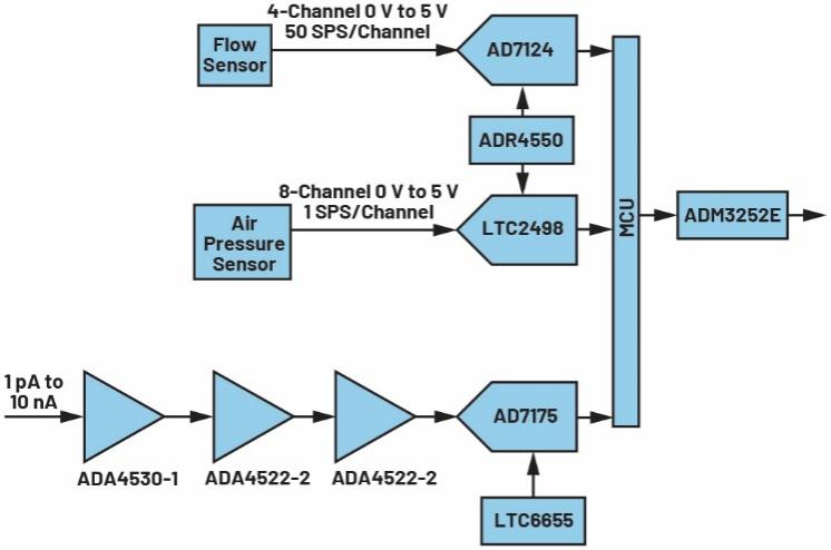 為了控制載氣準確流經(jīng)檢測器系統(tǒng)以分離混合物,高精度必不可少,這一點可通過使用氣體傳感器來實現(xiàn)。氣體傳感器的輸出多種多樣,比如電流信號、4-20mA環(huán)路信號、電壓信號等。圖3所示為進氣系統(tǒng)的信號鏈。