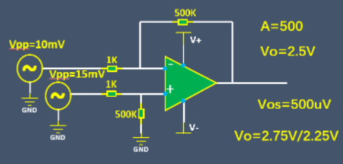 運(yùn)放的失調(diào)電壓的影響主要是當(dāng)我們?cè)谧鲂⌒盘?hào)的運(yùn)算,失調(diào)電壓就不能忽略了,會(huì)帶來(lái)一定的誤差。比如如下的加減運(yùn)算放大電路,本來(lái)輸出應(yīng)該是2.5V,但是實(shí)際輸出電壓仿真是2.75V或者2.25V。