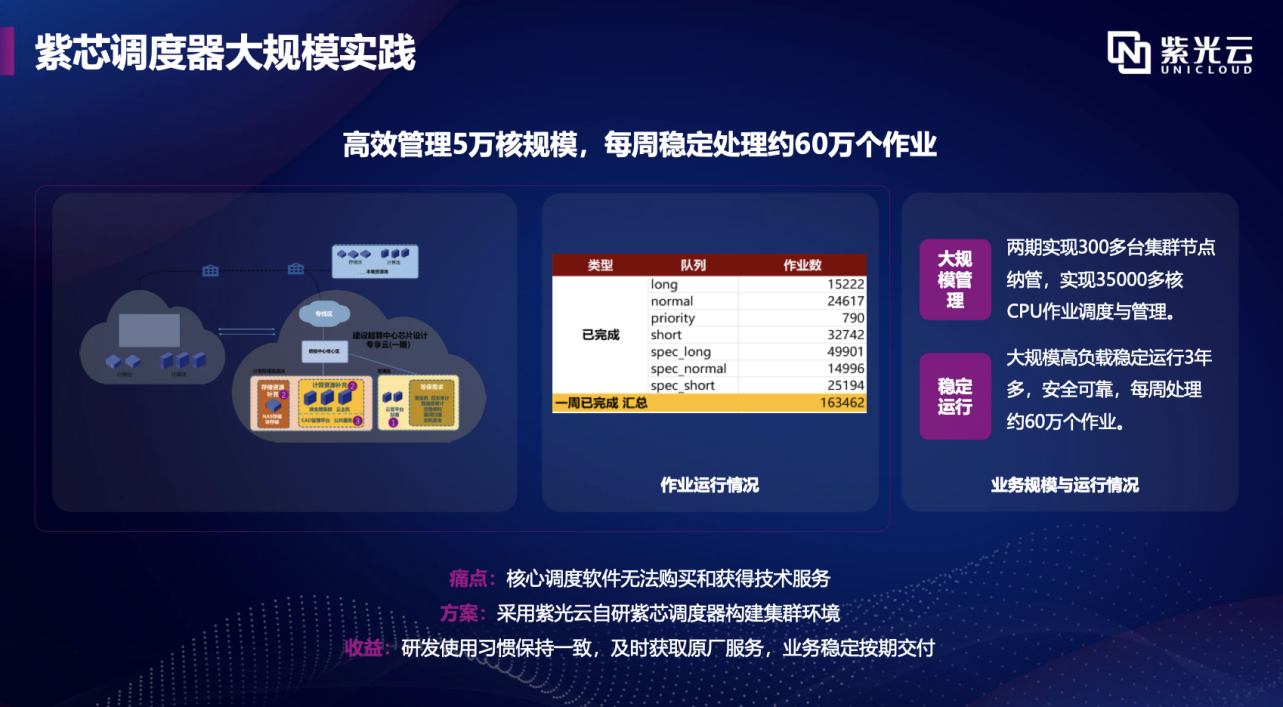 紫光云歷時5年自主研發(fā)了這一調(diào)度器。紫芯調(diào)度器具備兩個顯著特點:一是操作體驗一致:與國外領(lǐng)先廠商的軟件使用習慣保持一致;二是高效調(diào)度與大規(guī)模管理:支持大規(guī)模資源管理與調(diào)度,實現(xiàn)資源的高效利用。