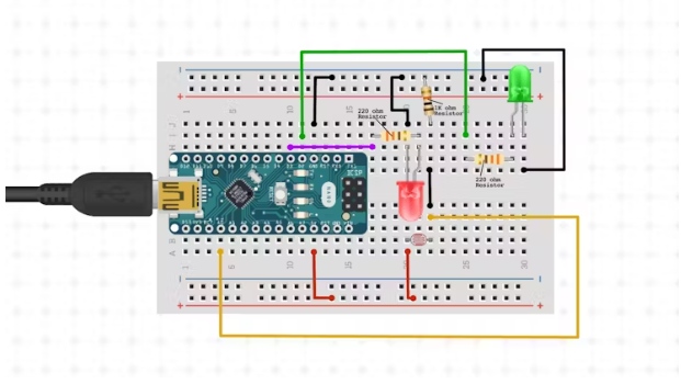 LED模擬生物發(fā)光細菌。光傳感器/光敏電阻檢測來自初始LED的光。這將觸發(fā)Arduino激活第二個LED來表示感應(yīng)到光線。