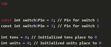 為開關(guān)聲明了兩個(gè)引腳,并初始化了十進(jìn)制和單位的變量。
