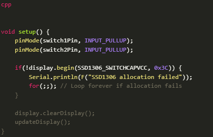 在設(shè)置功能中:開關(guān)的引腳設(shè)置為帶有內(nèi)部上拉電阻的輸入模式。初始化OLED顯示屏。如果失敗,程序?qū)o限循環(huán)。將清除并更新顯示以顯示初始值。