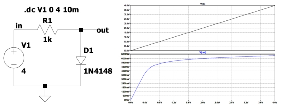 在模擬開始時,V1從0V開始,逐漸增加到4V。1K電阻限制電流通過電路。1N4148二極管的閾值電壓約為0.7%。這意味著對于"輸出"節(jié)點電壓低于約0.7%的電壓,二極管不導電。當電壓超過0.7%時,二極管將開始導電,允許電流通過二極管。顯然,這個值的趨勢是模擬的,而不是數字的,所以電壓的變化越來越大,而不是突然的變化。由于二極管的特性,超過0.7%時,二極管上的電壓幾乎保持在0.7%。