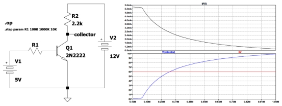 這兩個圖代表了晶體管在電路中相對于通過基阻流動的電流的行為。上圖顯示電流通過電路的負載電阻流動,因為基流變化。坐標軸(y-軸)代表以毫米為單位的電流,而橫坐標軸(x-軸)代表電阻R1的值。底部圖顯示的電壓在收集器;同樣,隨著基礎電阻變化.坐標軸(y軸)代表電壓,而橫坐標軸與第一個圖相同,并顯示參數R1。如你所見,收集器電壓為VCC/2的理想點是基阻值約為331kb,在2.73mA的收集器電流中。能夠觀察電阻值域中的圖表是非常有用的,因為它允許用戶仔細選擇電子元件,而不必運行幾個電子模擬。電容器和電感器也是如此。