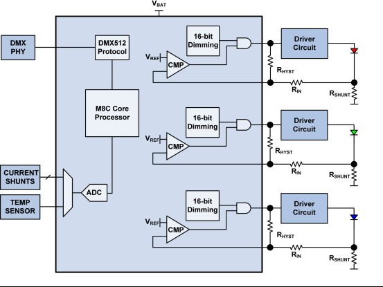 通信接口可以是從標(biāo)準(zhǔn)照明協(xié)議,如DMX512或達利,到之比或無線USB。智能是由一個內(nèi)置模擬數(shù)字轉(zhuǎn)換器(ADC)和激光縮小外圍設(shè)備的單片機提供的。ADC監(jiān)控系統(tǒng)的變量,如溫度、LED電流和色彩混合任務(wù)。驅(qū)動器為通道中的每一個LED提供恒流.驅(qū)動程序的復(fù)雜性和質(zhì)量決定了驅(qū)動程序的價格。