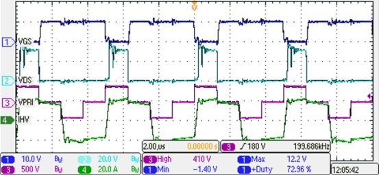 圖5 和 圖6 顯示,它使用的是在200KKZ開關(guān)頻率下工作的主動(dòng)鉗位電路。圖5顯示整流器的電壓應(yīng)力。
