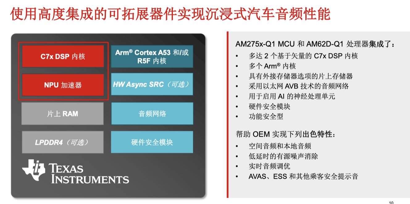 隨著汽車從出行工具轉(zhuǎn)變?yōu)椤暗谌羁臻g”,車內(nèi)音頻系統(tǒng)的作用愈發(fā)重要。從沉浸式3D立體聲到語音交互,再到主動(dòng)降噪和安全提示,智能座艙對(duì)音頻技術(shù)提出了更高的要求。這些需求不僅要求更強(qiáng)的音頻處理能力,還需要兼顧復(fù)雜算法的高效運(yùn)行與整體系統(tǒng)的低成本。這一背景下,TI最新發(fā)布的AM275x-Q1和AM62D-Q1兩款芯片,以及TAS6754-Q1功放產(chǎn)品,正是為滿足這些新需求而生的技術(shù)突破。