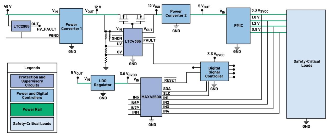 另一個考量因素是有沒有安全文件來證明符合功能安全要求,尤其是在認(rèn)證功能安全標(biāo)準(zhǔn)時。符合或獲得IEC 61508認(rèn)證的元件(例如MAX42500)已通過提供必要的安全文檔(安全手冊、故障模式影響和診斷分析(FMEDA)、良好的QMS等)來提供這方面的支持。盡管如此,考慮到IEC 61508的當(dāng)前修訂版本,按照圖5所示,仍可以使用非合規(guī)的產(chǎn)品(如LTC2965和LTC4365)來提高系統(tǒng)的診斷覆蓋率和穩(wěn)健性。然而,系統(tǒng)設(shè)計人員需要獲取必要的安全文件以滿足功能安全合規(guī)性要求。