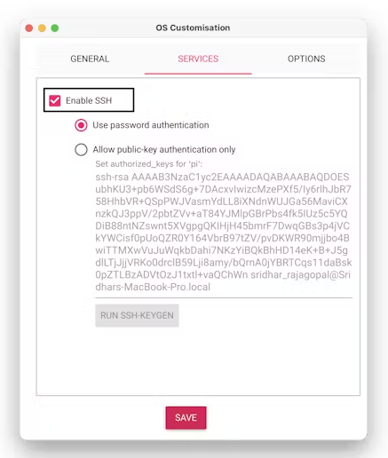由于我們將在無頭設(shè)置中使用樹莓派(未連接到顯示器或電視),因此您需要在它們上啟用SSH。我們還希望它們?cè)趩?dòng)時(shí)直接連接到無線網(wǎng)絡(luò)。我們可以使用樹莓派Imager工具設(shè)置提供WIFI網(wǎng)絡(luò)名稱和密碼憑證。