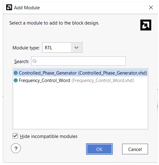 從GitHub存儲庫下載這兩個VHDL文件,并將它們作為新源添加到項目中。接下來,右鍵單擊塊設(shè)計并將FCW和相位累加器作為模塊添加到您的設(shè)計中。