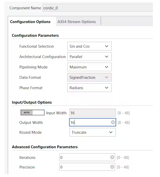 從IP目錄中,向設(shè)計中添加CORDIC IP塊。修改CORDIC輸出功能以生成正弦和余弦值。